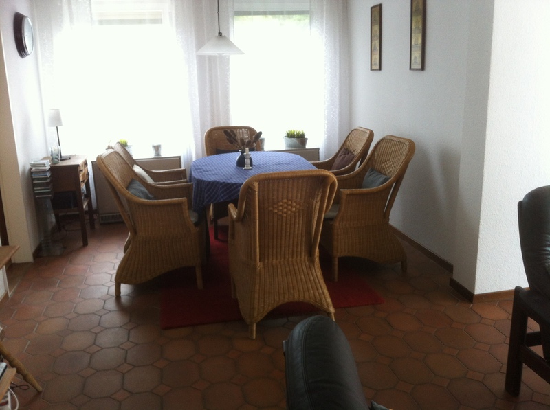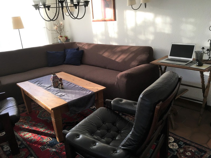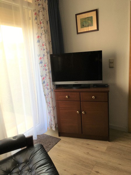 DVD-Player und kleiner Stereoanlage ausgestattet. Vom Wohnzimmer aus haben Sie durch eine große Schiebetür Zugang zur teilüberdachten Süd-Terrasse (komplett ausgestattet mit Gartenmöbeln) mit