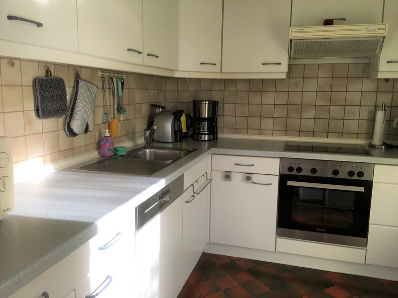 Die Küche ist komplett ausgestattet: Elektroherd mit Ceranfeld und Backofen, Kühlschrank mit Gefrierfach, Spüle, Spülmaschine, Mikrowelle, Kaffeemaschine, Wasserkocher, Heißluftfriteuse und