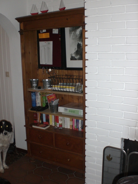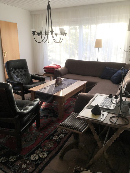 Das Wohnzimmer mit Kamin ist in zwei Bereiche aufgeteilt: Essecke mit Tisch und 6 Stühlen, Sitzecke mit Ecksofa und 2 Ruhesesseln. Es ist mit einem Flachbildfernseher (über Satellitenanlage),